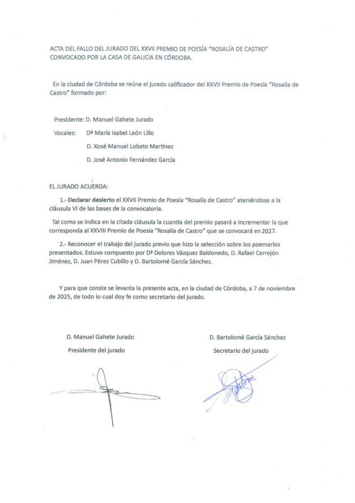 Reunido el jurado del certamen poético Rosalía de Castro en su XXVII convocatoria (2025), constituido por Manuel Gahete Jurado, como presidente, Xosé Manuel Lobato Martínez, Maribel León Lillo y José Antonio Fernández García como vocales, actuando como secretario en representación de la Casa de Galicia en Córdoba, Bartolomé García Sánchez, ha decidido, según estipulan las bases, dejar desierto el Premio, por entender que ninguna de las obras presentadas reúne los suficientes méritos para alcanzarlo, dada la relevante nómina de autores y autoras que lo han venido obteniendo a lo largo de tantos años en favor de la poesía, amparados por el inolvidable nombre de nuestra escritora gallega Rosalía de Castro, capital representante de las Letras Españolas y paradigma por antonomasia de la poesía escrita por mujeres. Vivimos un momento histórico en que debe potenciarse especialmente la calidad de la obra artística, medida por el compromiso y la exigencia. El jurado reconoce el esfuerzo y la fidelidad de tantos escritores y escritoras que han venido confiando en la honorabilidad de este Premio y entiende que debe seguir manteniendo el nivel de calidad que lo prestigia en justa correspondencia con los galardonados en las convocatorias anteriores y, sobre todo, con la excelencia de la poesía.